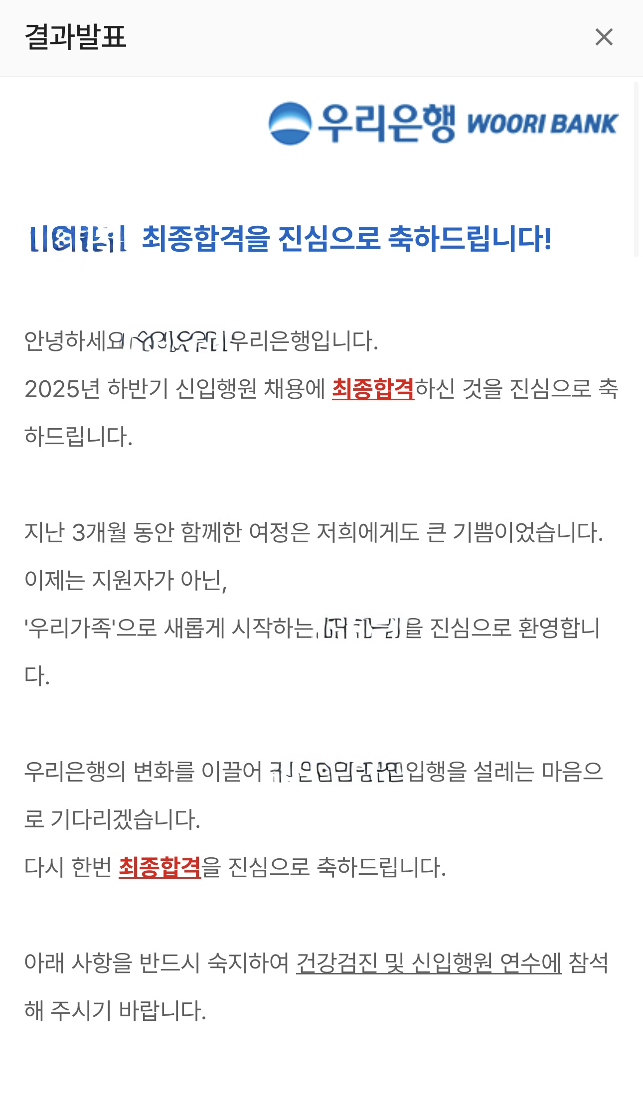 안녕하세요. 25년 하반기 우리은행 최종 합격자입니다.