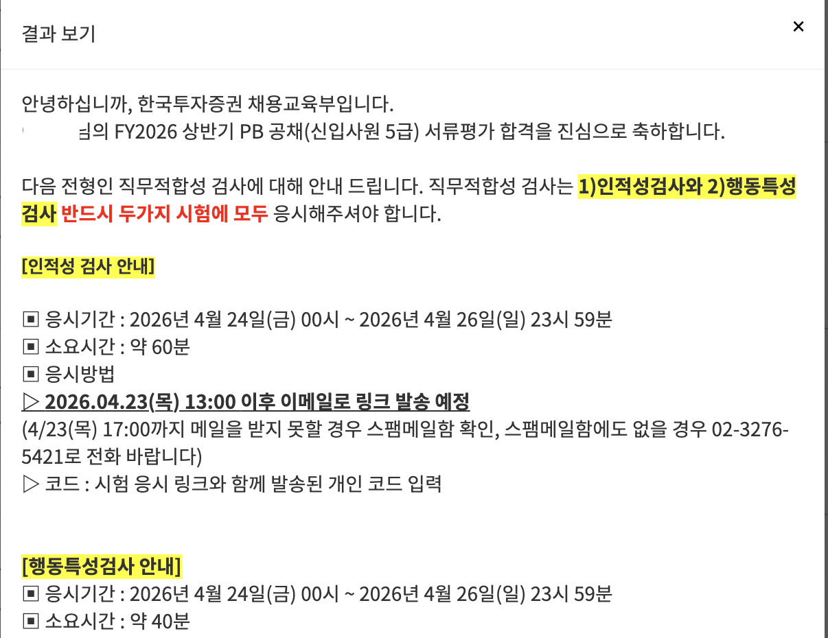 한국투자증권 5급 PB 서류 합격