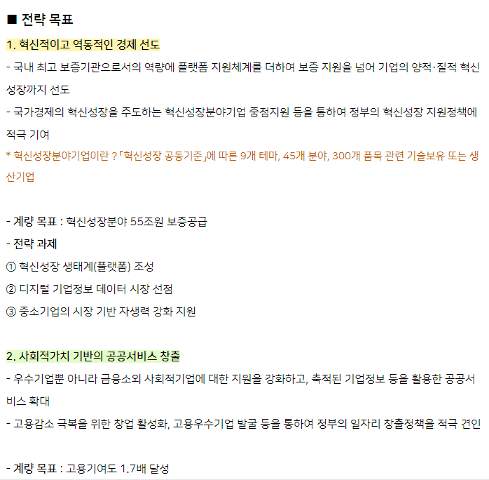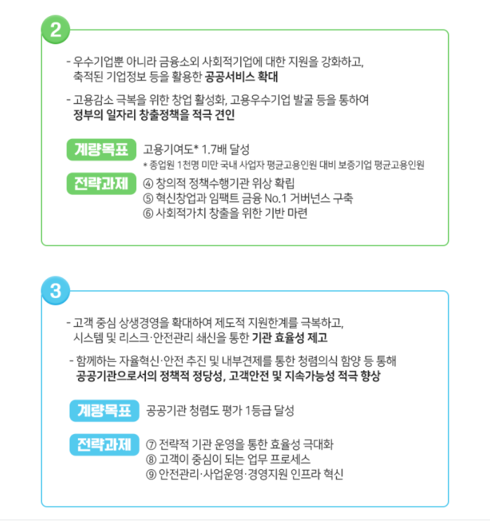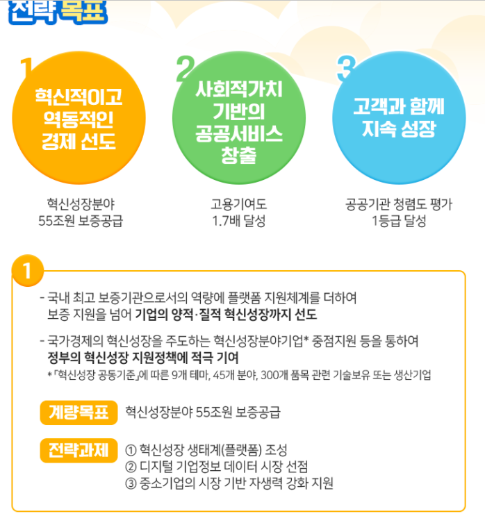 3. 신용보증기금은‘기업의 도전과 성장에 힘이되는 동반자’라는 비전을 세우고, 이를 실현하기 위해 ①혁신적이고 역동적인 경제 선도,②사회적가치 기반의 공공서비스 창출,③고객과 함께 지속 성장이라는 3대 전략목표를 설정하고 있습니다.