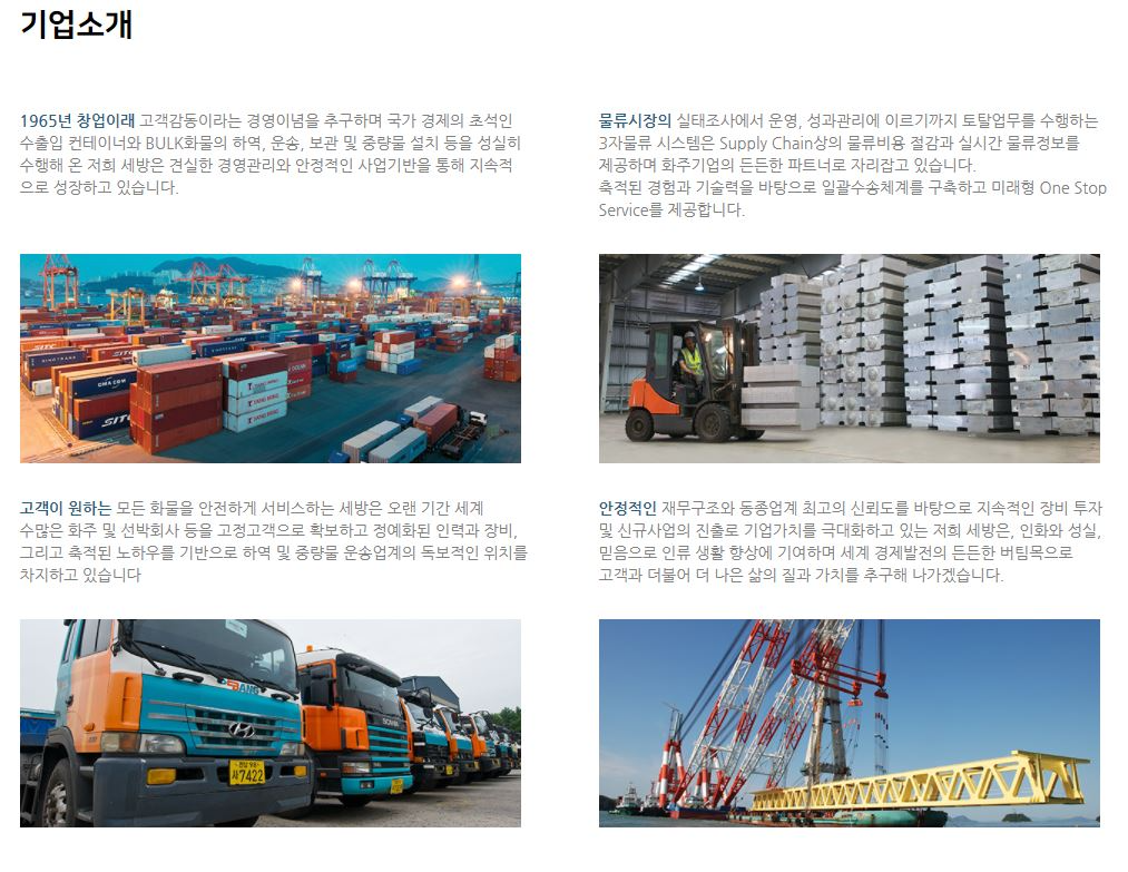 -세방은 1965년 설립되어 전국 12개 항만에서 벌크·중량화물 전용부두를 운영하는 종합물류기업입니다.
