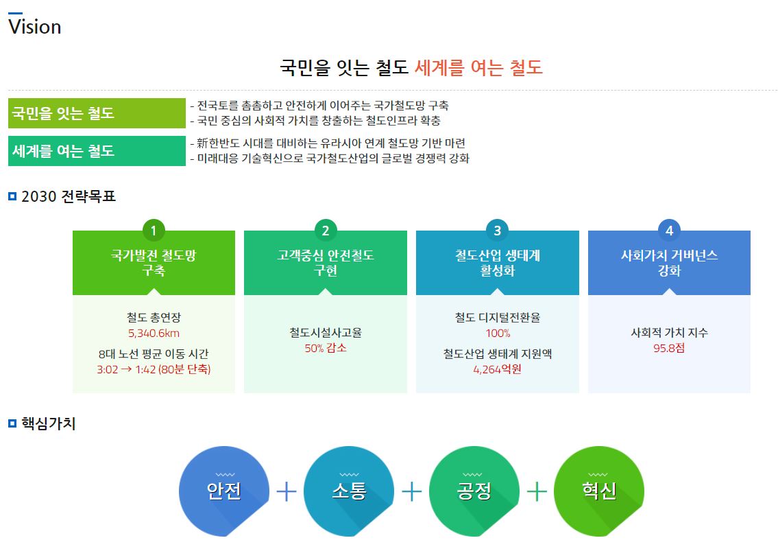 국내의 모든 철도 건설과 해외 철도 사업 진출 및 동북아 철도망 구성 등 다양한 철도사업을 지속적으로 추진하여