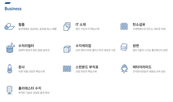 이에 주로 필름, IT 소재, 부직포, 원사, 수지 등의 핵심 생활소재부터 탄소섬유, 수처리, 신재생 에너지 분야에 이르는 친환경 첨단소재까지 사업 영역을 넓혀가고 있다.