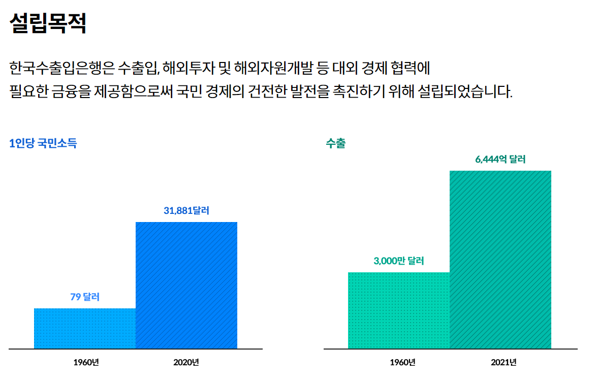 “한국수출입은행은 수출입, 해외투자 및 해외자원개발 등 대외 경제 협력에 필요한 금융을 제공함으로써 국민 경제의 건전한 발전을 촉진하기 위해 설립"