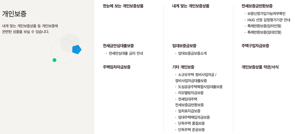 개인보증과 관련해서는 주로 전세보증금과 관련하여 보증상품을 제공하고 있습니다.&nbs