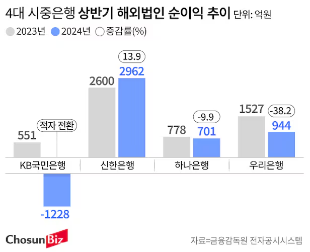 4대 시중은행이 올해 상반기 해외에서 벌어들인 순이익이 전년 동기 대비 40%가량 급감한 것으로 나타났습니다.